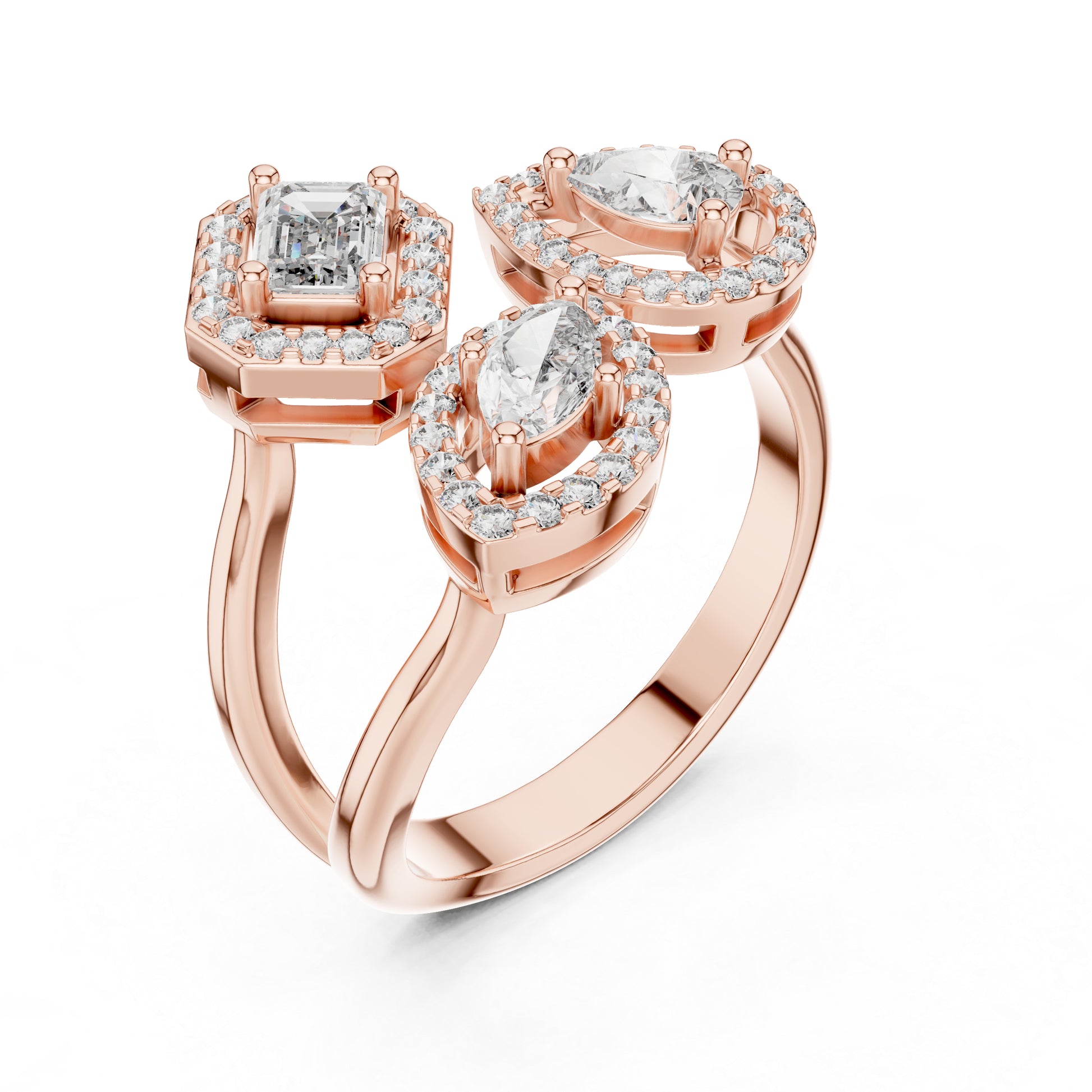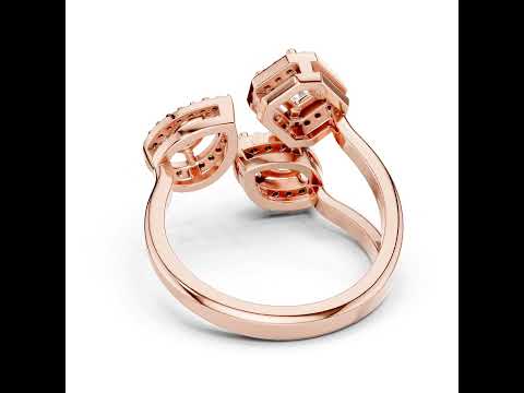 This 18K Rose Gold Stud Ring features Emerald, Marquise, and Round lab-grown diamonds arranged in a multi-cut luxury design for bold and elegant styling.