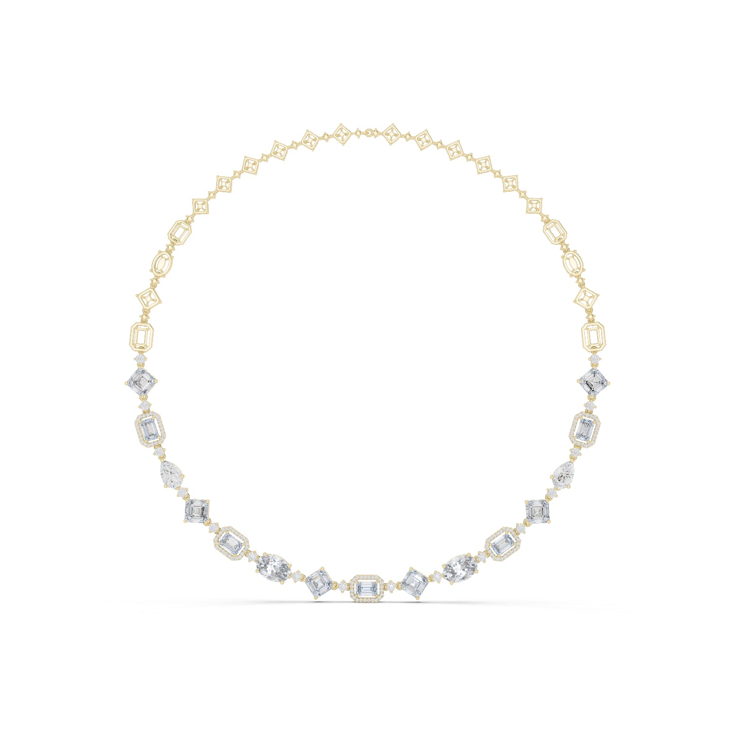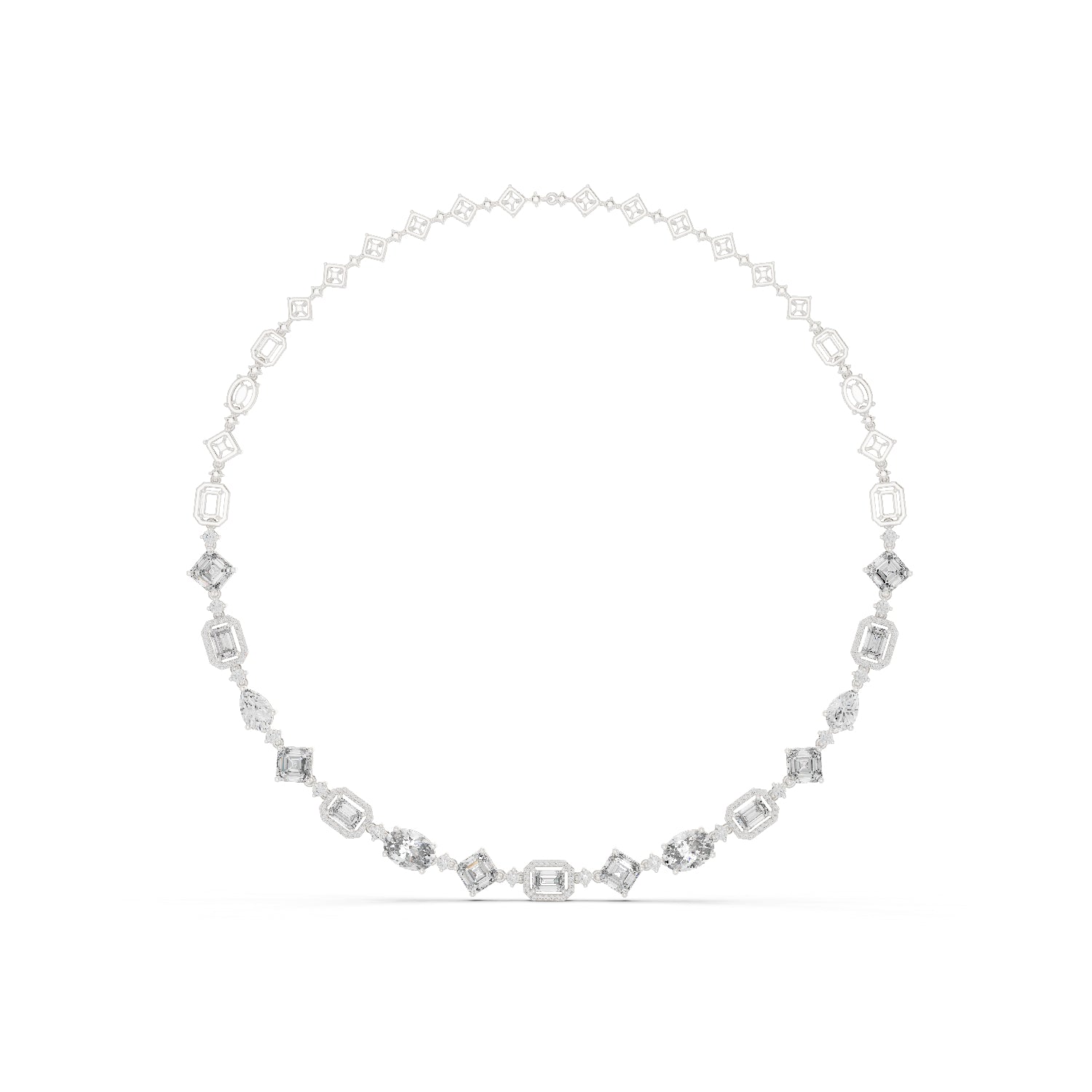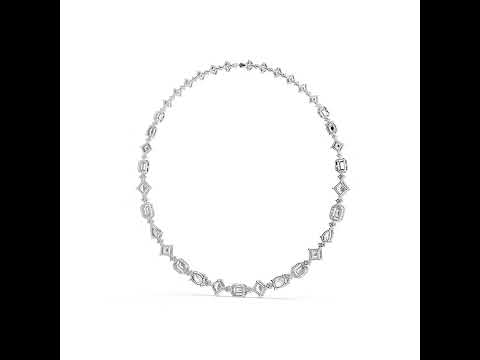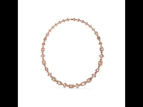 This 18K Rose Gold Party Wear Necklace features Pear, Emerald, Oval, and Round lab-grown diamonds offering vibrant brilliance for festive and glamorous styling.