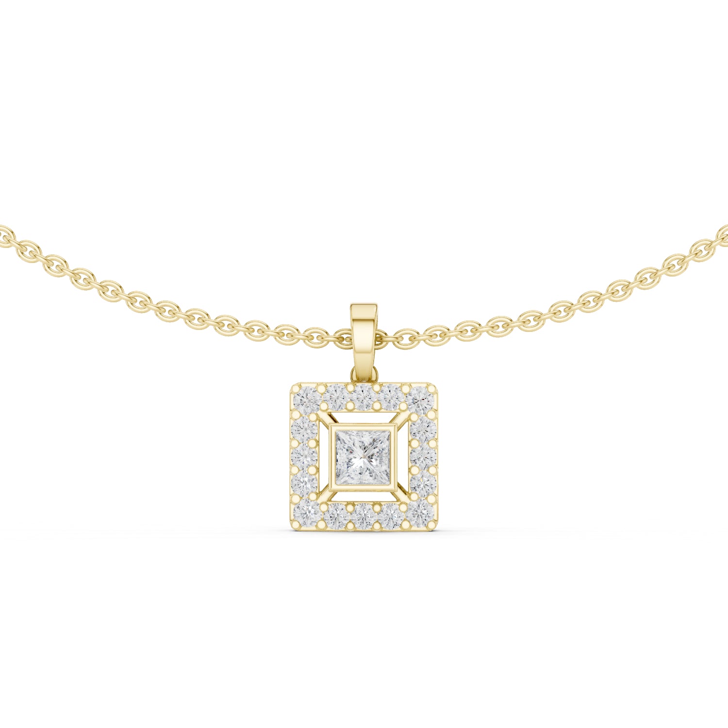 This 18K White Gold Party Pendant features Princess and Round lab-grown diamonds for bold sparkle ideal for festive and glamorous events.