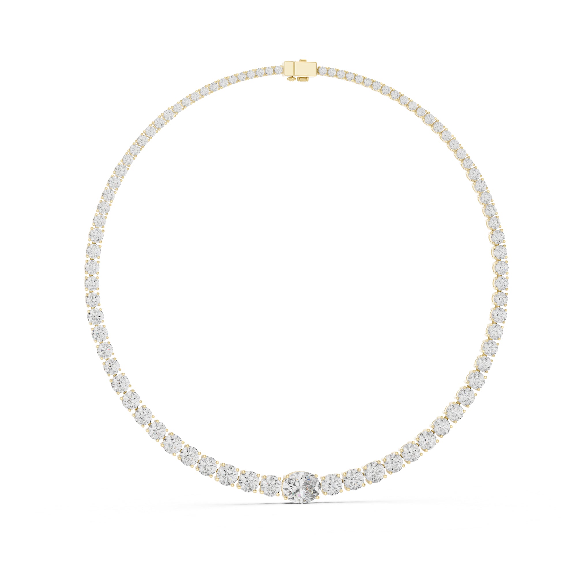 This 18K Yellow Gold Necklace features Oval and Round lab-grown diamonds, offering a refined sparkle suitable for daily wear and elegant casual styling.