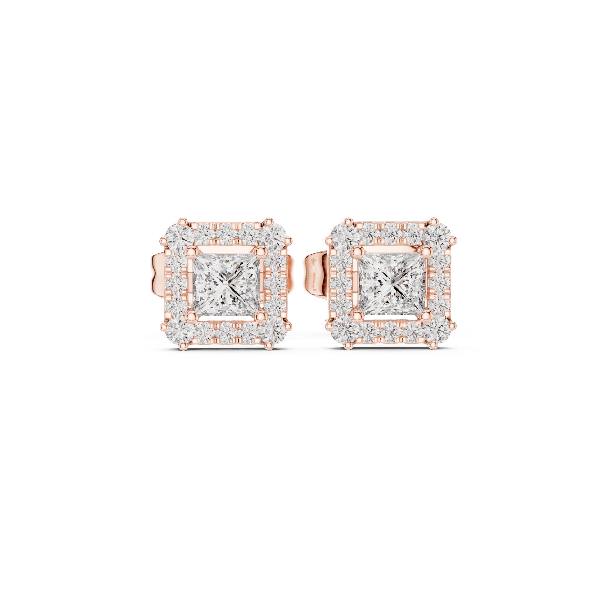 These 14K yellow gold round & princess lab-grown diamond engagement earrings combine classic sparkle with modern geometric design, ideal for women who love stylish and elegant jewellery. Perfect for engagement outfits and special occasions.