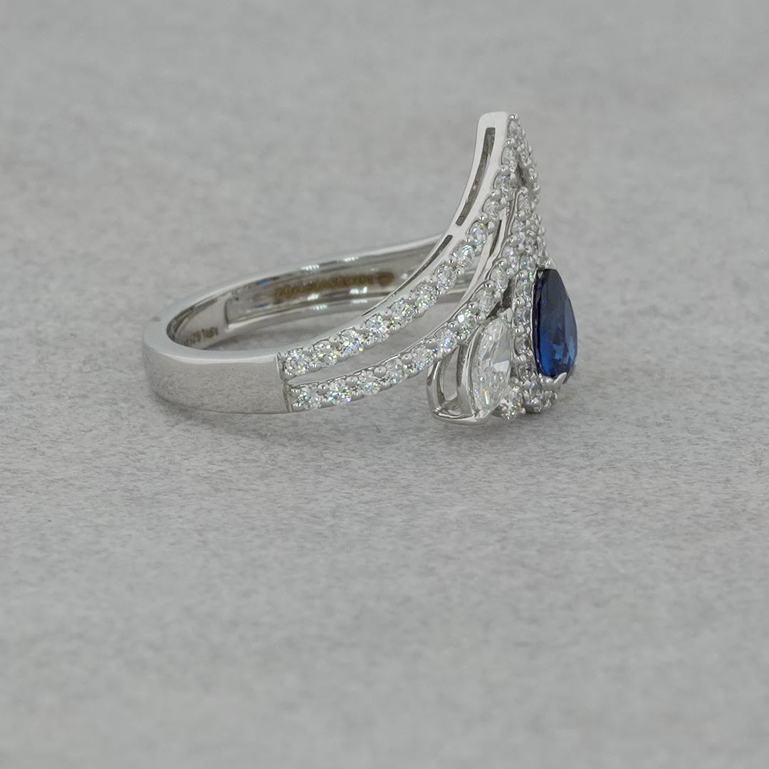↦ Blue Pear Cut Diamond Curve Shape Double Row Ring is a true statement of elegance. this ring is designed to captivate with its brilliance and unique shape. The gracefully curved band is adorned with a double row of accent diamonds.
