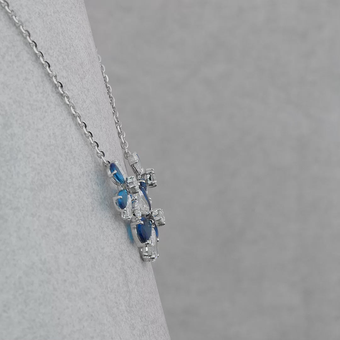 This blue pear and round cut diamond floral necklace is crafted in 14K yellow gold. Designed as elegant proposal jewelry, purecarat ensures refined style and exceptional quality.