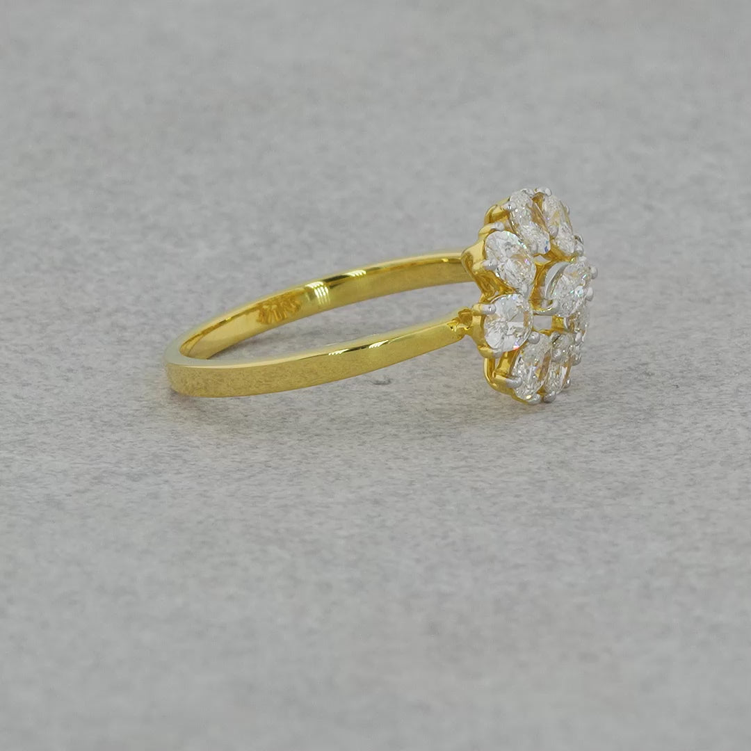 ↦Discover Purecarat's captivating yellow gold floral diamond ring, featuring a dazzling marquise-cut center and sparkling diamond petals. Perfect for a unique statement.