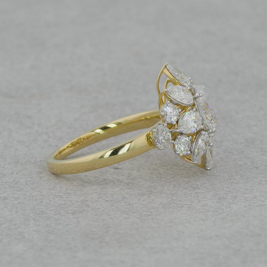 ↦ Sunburst or Floral Cluster Diamond Ring is a true statement of sophistication. Featuring a dazzling oval-cut diamond at its center, encased in a shimmering pear-shaped halo, this design enhances the stone’s radiance while adding a unique touch.