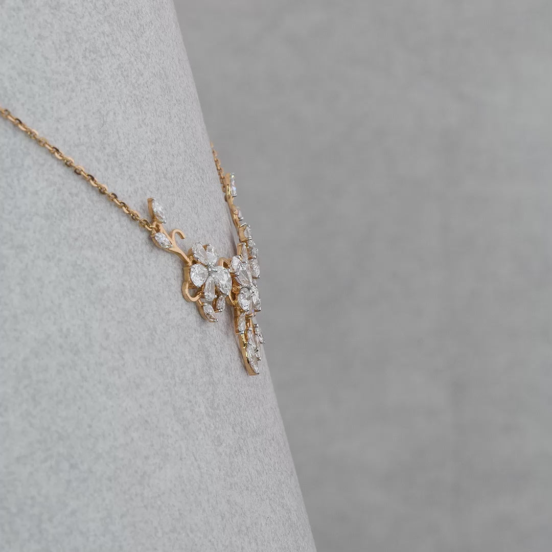 This exquisite necklace features a blend of pear and marquise cut diamonds set in luxurious 18K yellow gold. Designed for proposal moments, it offers a unique and elegant style that radiates timeless beauty. Purecarat ensures superior craftsmanship and brilliant sparkle for a truly memorable gift.