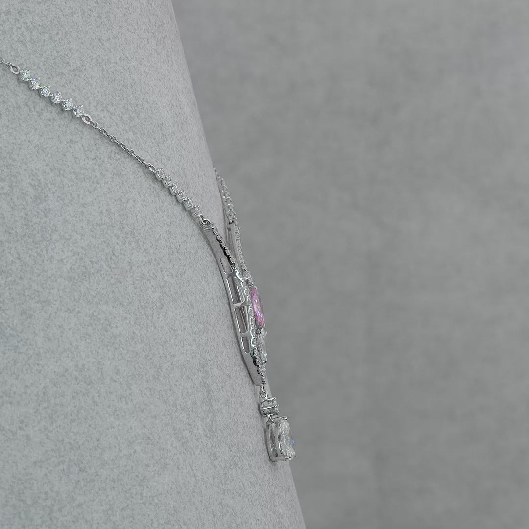 ↦ Exquisite Featuring a breathtaking marquise-cut pink lab-grown diamond at its center, this exquisite piece is surrounded by a cascade of sparkling round and pear-cut diamonds, creating a luxurious and radiant design. Set in lustrous gold, this necklace embodies grace, sophistication epical day and beyond