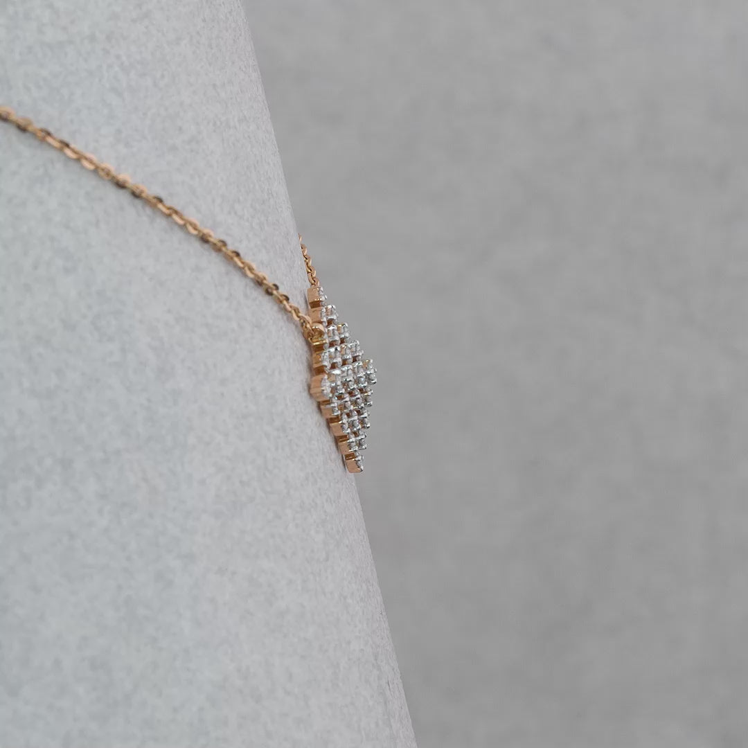 ↦ Round Cut Diamond Diagonal Shaped Necklace features a stunning arrangement of brilliant round cut diamonds, elegantly set in a unique diagonal pattern.