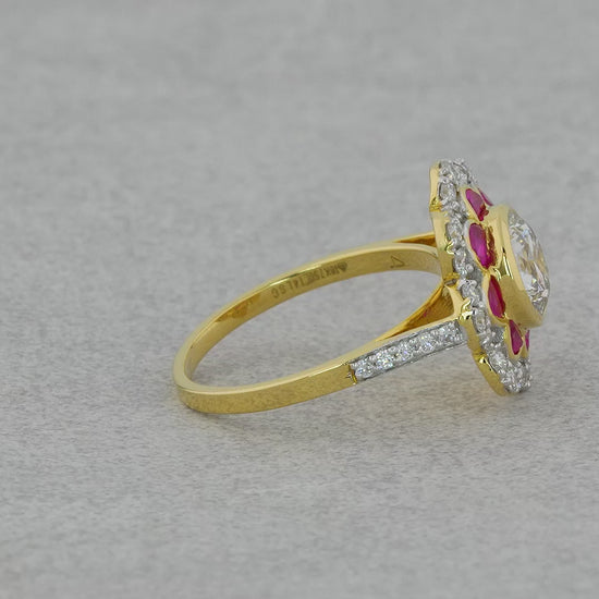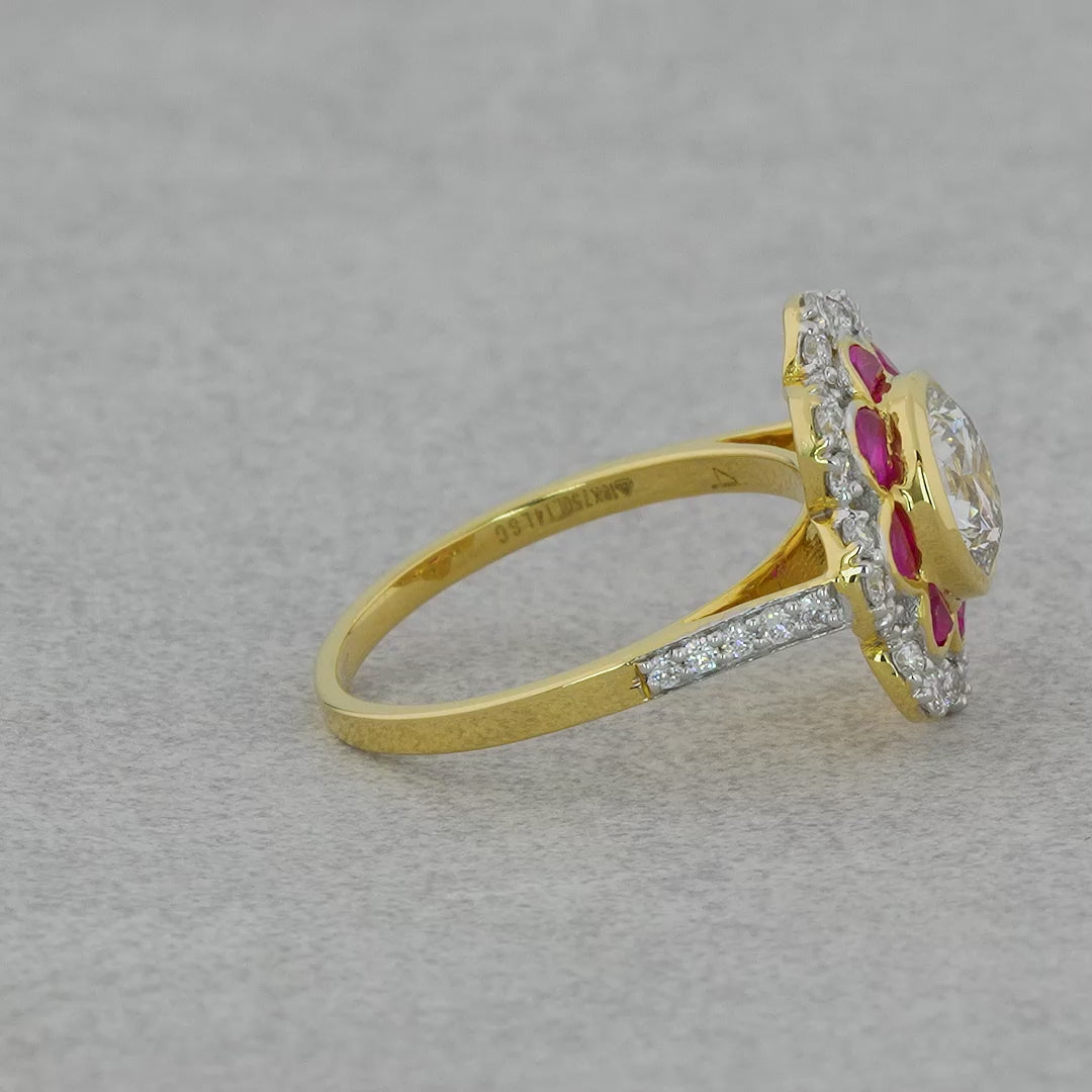 ↦Discover Purecarat's captivating 18K yellow gold and platinum ruby and diamond ring. This unique ruby daisy ring features a brilliant floral design, perfect for any occasion