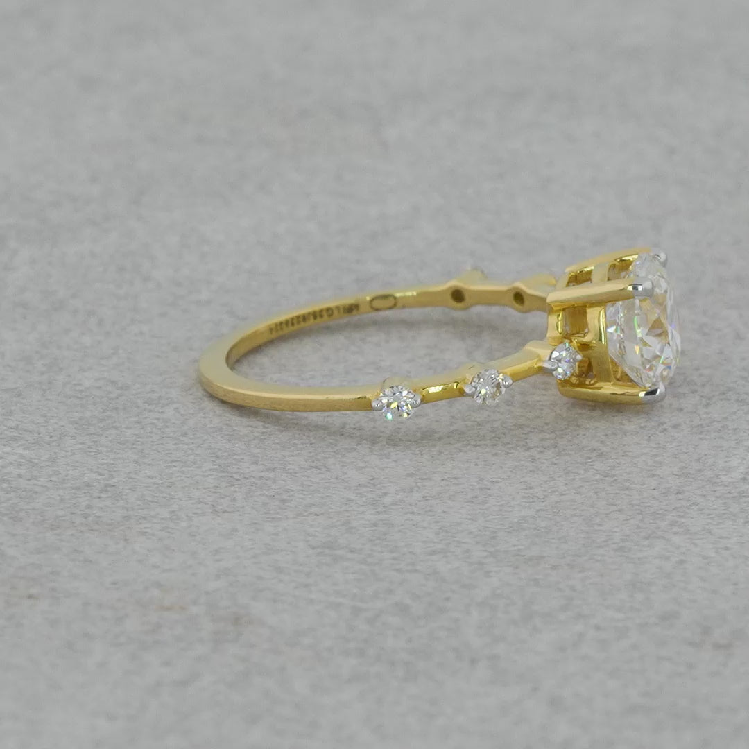 ↦ Round Cut Diamond Solitaire with Accent Ring beautifully blends classic elegance with a touch of modern brilliance. Showcasing a stunning round-cut center diamond, this ring is further enhanced by delicately set accent diamonds along the band, adding extra sparkle and sophistication.